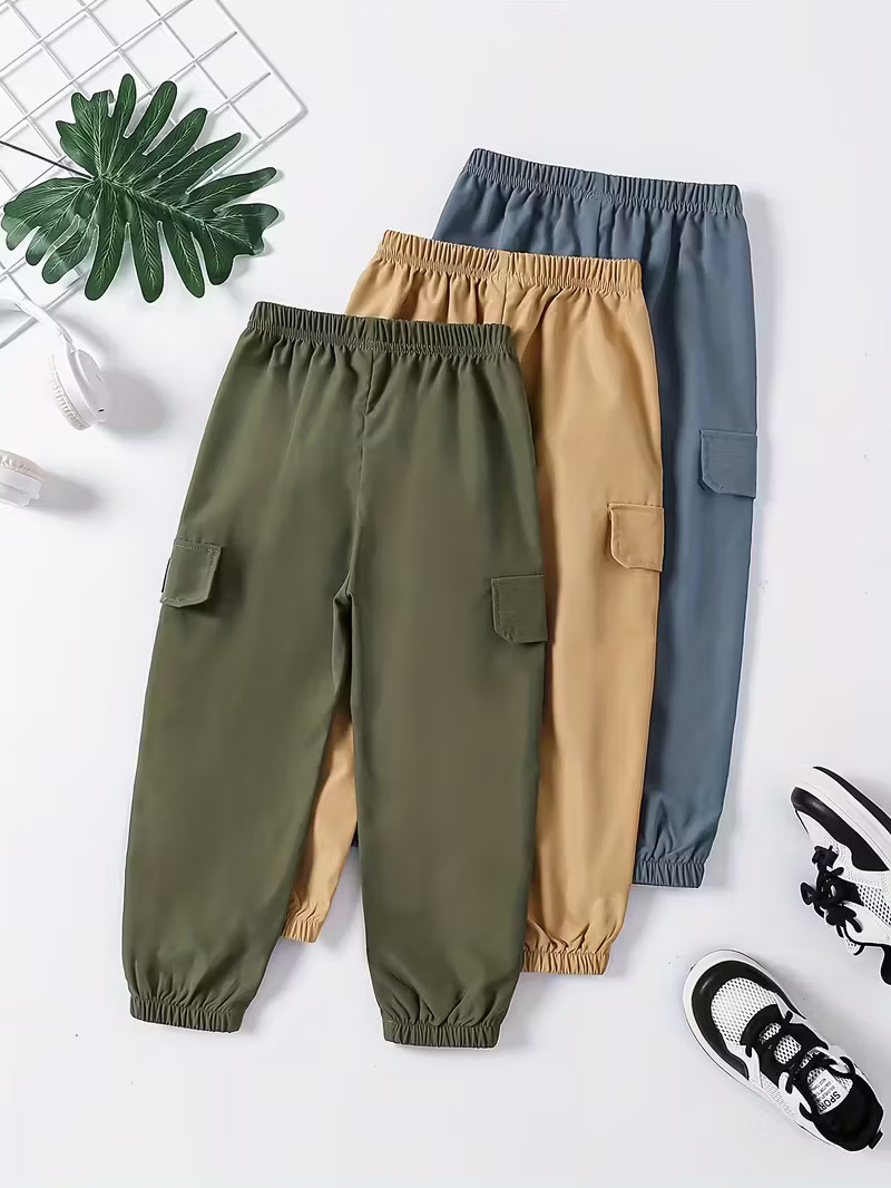 These kids solid-color cargo joggers offer a clean and modern look. Designed with elastic cuffs and functional cargo pockets, they balance style and practicality. Ideal for daily wear and outdoor activities.