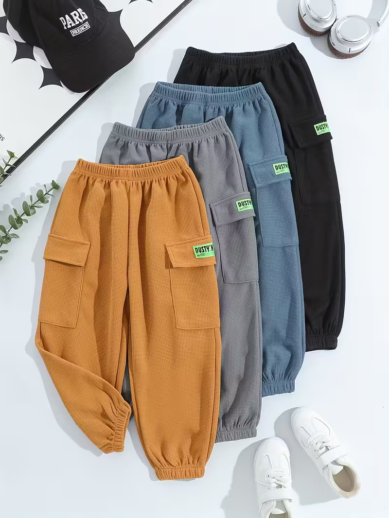These kids waffle-texture cargo jogger pants are designed for comfort and durability. Made from breathable fabric with a soft feel, they feature an elastic waistband and cuffed ankles for a secure fit. Functional cargo pockets add utility while maintaining a stylish everyday look. Perfect for play, outings, or casual wear.